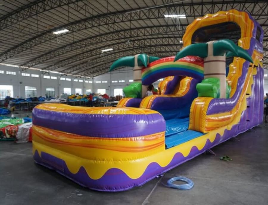 Make your next backyard party truly unforgettable with the 18 Ft Purple Tropical . This vibrant and exciting inflatable water slide is designed to provide hours of safe, splashy fun for kids and adults alike. Standing at an impressive 18 feet tall, 18 feet wide, and 25 feet long, it’s the ultimate centerpiece for birthdays, family gatherings, summer camps, and community events throughout our delivery areas.
